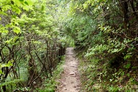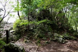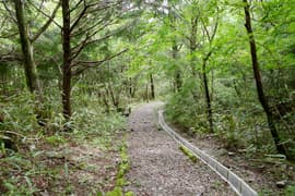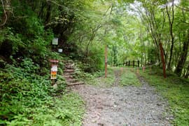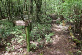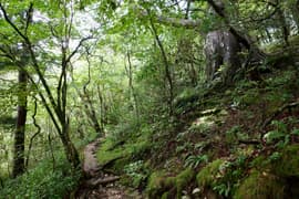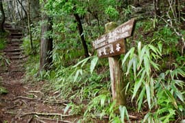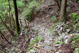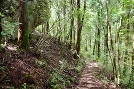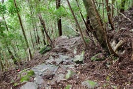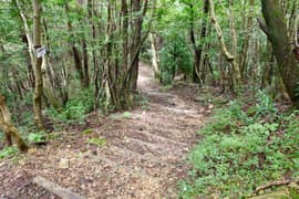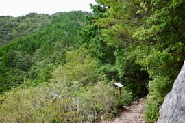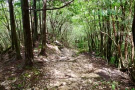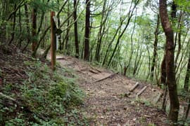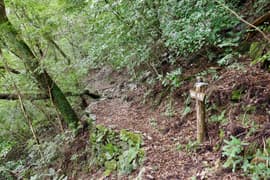 工石山への道に入り、大きくジグザグを切りながらゆるゆると登ると、杖塚と呼ばれる分岐点に着き、南回りコースと北回りコースに分かれる。どちらを行っても工石山の山頂に至るが、ここは左の南回りコースへ入ると、山腹をほぼ水平にトラバースする道となる。