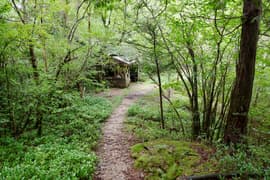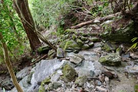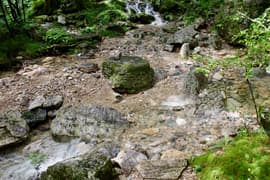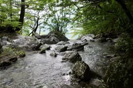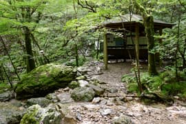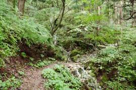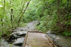 檜屛風岩を過ぎると渓流を渡渉する箇所がある。ここが賽の河原で、休憩舎もある。説明板によると、この河原はサンショウウオが観察できるポイントだそうなので、河原の石をゆっくりはぐって探してみたが見つからず、残念(石は元に戻す)。遊んでいる間に年配のおじさんグループに追い付かれる。