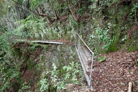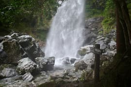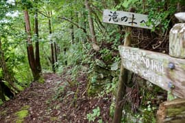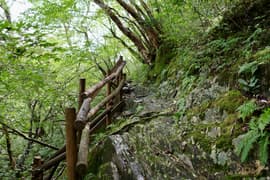 橋を渡り、岩場を石段で登る。流水を渡り、トラバース道を進む。やがて「←西滝へ0.1km」の道標があり、右に滝の上へ向かう踏み跡を分ける。あと僅かの距離だ。