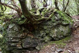 少し先には「天空の窓」というおすすめポイントがあり、大岩に根を張って大きな木が生えている。これはヤマグルマ、別名トリモチノキと呼ばれる常緑樹だそうだ。根本を下から見上げると、天窓のような隙間がある。