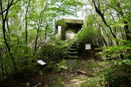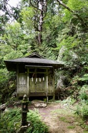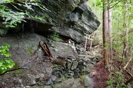 休憩後、北回りコースで下山する。短い急坂を下ったところの平坦な鞍部が桜岩園地で、休憩舎がある。また左手に古い木鳥居がある。鳥居を潜って少し下ると、大岩の基部に工石神社の小さな社が建つ。なかなか神さびた雰囲気がある。神社の下にも鳥居があり、参道が通じているようだが、登山道としては整備されていない。