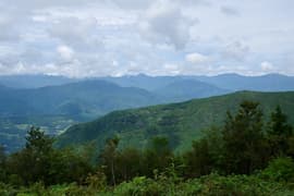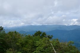 桜岩園地に戻って先に進み、少し登って「北の頂」のピークに着く。こちらのピークは北方の展望が開け、山間の棚田を俯瞰し、四国山地中央部の山並みを遠望する。展望板があり、それと見比べながら山座同定を試みるが、ところどころ雲に隠されて難しい。石鎚山辺りは雲の中、瓶ヶ森、鋭峰の伊予富士、寒風山はなんとか識別。工石山と赤良木峠を経由して峰続きの三辻山が見え、その向こうに奥工石山辺りの山並みを遠望する。見渡す限り山また山で、秘境感がある。四国の山、奥が深い。