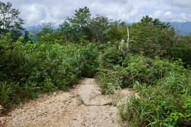 良く整備されているが、樹林に覆われて、やや単調な山道が続く。途中に「おすすめポイント⑭ ヤッホーポイント」の案内板があり、山並みの間から土佐湾が見通せる。