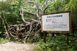 さらにゆるゆると尾根道を下ると、天然檜風倒根がある。昭和38(1963)年の台風で倒れた檜(推定樹齢200年)とのこと。根っこが巨大なオブジェと化している。
