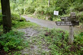 森林公園に続く車道を右に見送り、左の歩道に入る。最初は整備された幅広い道だが、途中、木橋で渡る枝沢は増水して洗い越しのような状態になっている。やがて、左に東滝渓谷への道が分かれるので、そちらを往復してみる。