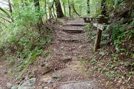 ここで道はY字に分かれるが、どちらを行っても先で合流する。右に進むと、赤良木展望台がある。岩場の上に苔むしたコンクリ製のテラスを設けたもので、三辻山が間近に眺められる他は木の梢に遮られて、見晴しはイマイチだ。