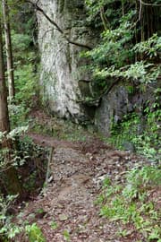 分岐まで戻り、西滝に向かう。右側は見上げるような岩壁、左側は樹林に覆われているが急斜面で切れ落ちたトラバース道を歩く。一応、整備された山道ではあるが、大雨のためか荒れている。滑落しないように注意して進む。