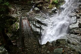 次の沢には簡易鉄橋が架り、すぐ上流にかなり高い滝が落ちている。無名の滝だが、大増水しているせいもあり、見応えがある。