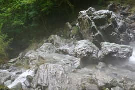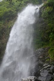 トラバースして極浅い谷間に入ると、巨石が積み上がった沢に出て、膨大な量の水が滝上から落ち、水飛沫が暴風雨のように吹き付ける。これは物凄い迫力だ。普段の水量はどれくらいだろう。この西滝も見えている範囲は一部で、全貌は窺えない。登山道は沢を渡渉し、さらに権現滝、大樽の滝まで続いているが、もう夕刻だし、ここの渡渉も危険だ。迫力ある西滝を見ることができたので、これで満足して往路を引き返す。