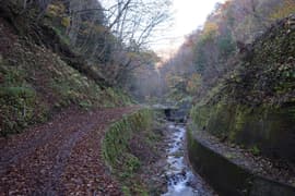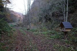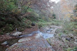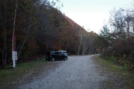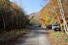 桐生を早朝、車で出発。R122、日光市街を経由し、R121(会津西街道)を北上。山王峠の前後は紅葉が真っ盛りで、車窓から観賞する。会津に入ってR352を走り、阿賀野川源流の荒海川を渡って左折。釣り堀を過ぎ、荒海川の明るく開けた谷の奥へ向かって未舗装の林道を突き進む。やがて、左手に新しい建物(赤倉中和処理場)が現れると、その先の広い路肩が八総鉱山跡の登山駐車場だ。「荒海山登山駐車場 登山口まで400m」の標識もある。既に駐車が4台あり、先行ハイカーさんが居られるようだ。
