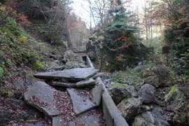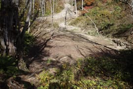 登山口からは崩壊・流失した林道跡を辿る。ところどころにコンクリ構造物の残骸を残す他は、大部分が自然に還って山道と化している。渓流を数回渡り返すと、板チョコを割ったように路盤が崩壊した区間に着く。出水の威力は凄まじい。傾いて濡れた路盤は滑り易く、注意して通過。手摺としてロープも張られている。
