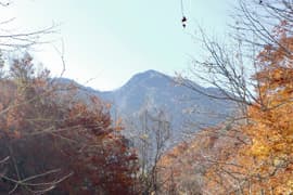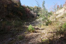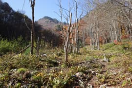 やがて、大量の土石が谷を埋めてできた斜面が現れ、その上にジグザグに付けられた道型を登る。この土石の量は凄い。振り返ると本流の谷を隔てて対岸の尾根が眺められる。快晴の空の下、赤や黄の斑らの紅葉が陽射しを浴びて、晩秋の山らしい良い雰囲気だ。