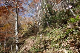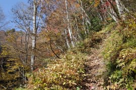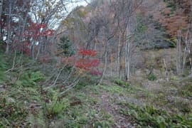 沢から離れ、山腹に取り付くと急登が始まる。この辺りの紅葉が一番綺麗だ。陽当たりも良くて見栄えがする。木の間を透かして荒海山の頂も眺められる。ところどころ古い固定ロープもある急坂をこなして、尾根上の鞍部に登り着く。
