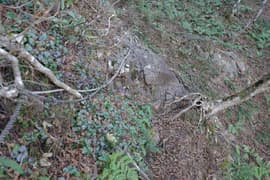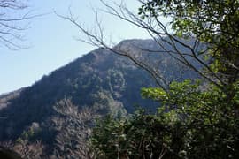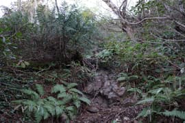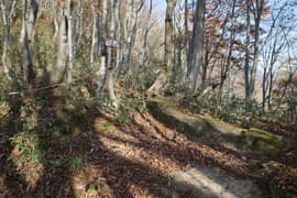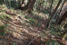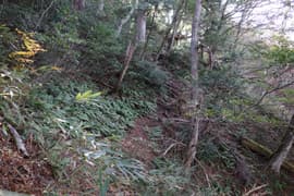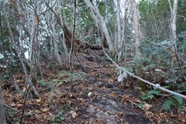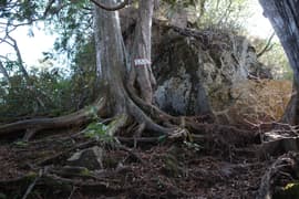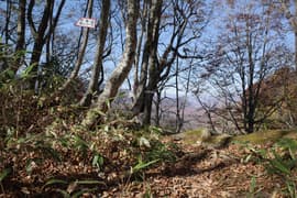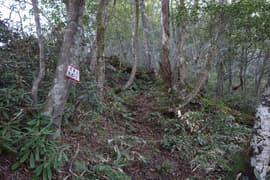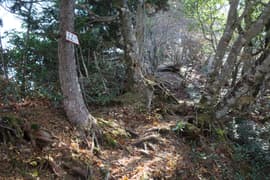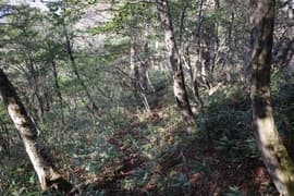 鞍部で少し休憩したのち、尾根道を登る。最初は丈の低い笹原が下生えの雑木林をゆるゆると登る。やがて黒木の樹林帯に入り、尾根の右手を絡む道となって、傾斜が増してくる。途中、岩場を交えた急坂があり、固定ロープの助けで攀じ登る。