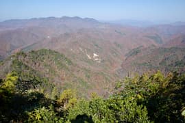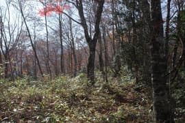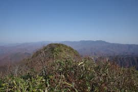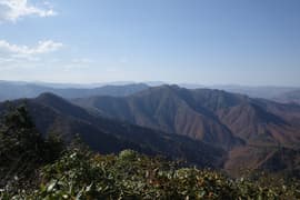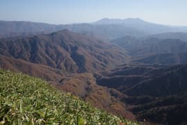 腹が満ちたところで、じっくりと展望を楽しむ。頂上の南斜面は笹原で、黄葉に包まれた入山沢の谷間を俯瞰し、7月に登った芝草山が意外と近くに眺められる。遠くには高原山の連嶺を望む。目を右に転じれば、栃木県北西部の山並みが広がる。逆光で靄っているうえ、私にとってはまだ馴染みが薄い山域なので、どれがどの山か分かり難いが、持丸山や明神ヶ岳は登ったことがあるから同定できる。右奥の抜きん出て高い山群は日光連山だ。