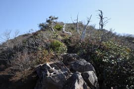 頂上稜線への急坂に取り付いて登ると、ほどなく大岩に突き当たる。大岩の右側を巻くと足元が切れ落ちた岩場のトラバースとなる。ここはネットの山行記録の写真でよく見た、ちょっとした難所だ。最初、僅かな距離だが、ロープのない下りがあり、下を見ると高度感があって緊張する。その先は手摺の固定ロープが張られ、問題なし。