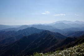 西には南会津の山々が広がる。こちらも馴染みが薄い。中央の山塊は土倉山のようだ。立派な山容で、いつか登ってみたい。彼方には尾瀬から会津駒にかけて長々となだらかなスカイラインが横たわる。北面は阿賀野川源流の荒海川の谷を俯瞰し、七ヶ岳を望む。