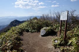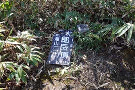 カメラだけを持って空身で向かう。笹が深く、低木帯の枝が煩わしいが、微かな踏み跡が通じている。三角点標石を発見。その脇には「太郎山(荒海山)山頂 イクイが入ります」と書かれた山名標識が落ちている。イクイって何と思ったら、ケイタイの文字が掠れたらしい。やまの町桐生の「荒海山(太郎岳)」の記事によると、かつて南面の入山沢からこの峰に上がる登山道が切り開かれたそうだが、今も歩けるのだろうか。東峰は激藪に囲まれて、来た道以外に登山道らしきものは見当たらない。
