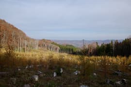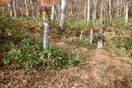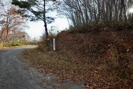 ハイカーさん2組は下岳経由で七ヶ岳を往復するようだ。私は黒森沢登山口に向かって七ヶ岳林道を歩く。なだらかな山裾を大きく蛇行しながら横切って行く。昨日に続いて今日も晴れているが、上空には薄雲が広がり始めている。周囲の山林の紅葉は終盤で、晩秋の高原情緒がある。伐採地から北側の眺めが開け、駒止湿原から舟鼻山にかけての真っ平なスカイラインが長々と横たわっているのが見える。平ら過ぎる山容で、逆に興味が湧く。