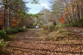 7時過ぎにキャンプ場を車で出発。山麓を北に向かい、富貴沢沿いの道に入る。わらび園の小屋の先で右に林道古桧峠線を分け、左の林道富貴沢線に入る。あとは一本道。わらび園の管理棟の脇を通り、広大なススキ野原を走り抜けて、林道七ヶ岳線に合流する。