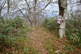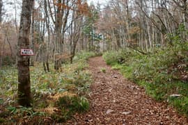 刈野畑橋(かのはたはし)を渡ってすぐの所が黒森沢登山口だ。道標と広い駐車場があり、車が1台。先行者が居られるようだ。登山口から林道に入り、緩斜面の樹林と下生えの笹原の間をゆるゆると登る。