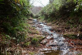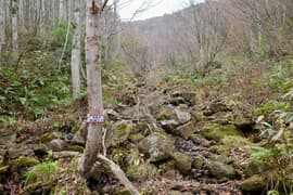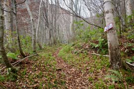 傾斜が緩んでロープが終わり、ほとんど平坦なナメとなる。周囲は笹原の緩斜面で、源流部の雰囲気。沢沿いの笹は刈り払いされて、整備の手が入っている。開放的で気分の良いルートだが、ここも足元が滑り易いので、気を付けて歩く。徐々に水量が細って二股に着き、道標にしたがって左の溝状の沢に入る。緩く登って行くと直ぐに水流は消え、樹林中の笹原を切り開いた登山道となる。