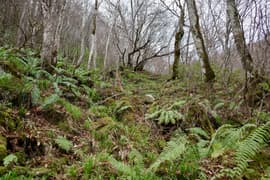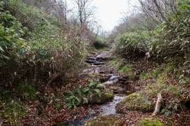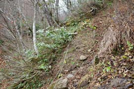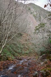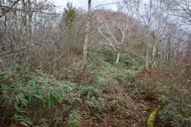 林道を20分ちょっと歩いたところで、林道のカーブから分岐して山道に入る。分岐点には「←黒森沢登山道」「←分岐点 ゴマ滝 50分」の道標がある。山道を辿ると黒森沢のゆったりと広い谷間に入っていき、だんだんと傾斜が増す。左岸の山腹をトラバースし、水量の少ない黒森沢を跨ぎ越して右岸に渡る。谷の上流は直線的に開け、青空が広がっていれば「気分はサイコー」と言いたくなりそうな景観だが、今日は上空がすっかり薄雲に覆われ、日差しが遮られて寒々しい雰囲気である。