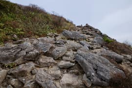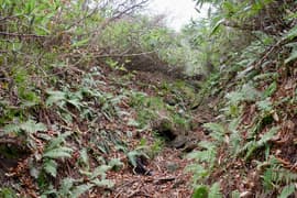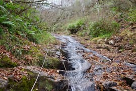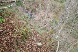 護摩滝の下に降り立って、滝を見上げる。傾斜がきつい階段状の滝で、幾筋かに分かれた水が細々と流れ落ちる。滝壺はない。見えている落ち口は高く、さらにその上も滝になっているようだ。滝にはロープが下がっている。えー、これを登るの、完全に沢登りじゃん😱、と一瞬焦ったが、左岸にちゃんと高巻き道があるので、そちらに進む。巻き道も急斜面にロープが張られているような難路で、気が抜けない。