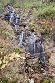 登山道は右岸に移り、急な山腹を高く巻いて登る。ここまでの歩き易い登山道とは変わって、道型は細く、滑り易い急坂が連続し、ロープが張られた箇所もある。まるで沢登りの大高巻きの道だな。大きく巻いたのち、ロープが張られた急斜面を下り始めると護摩滝が見えて来る。これはかなり落差のある滝だ。