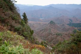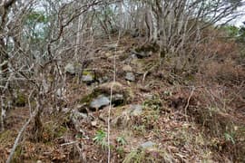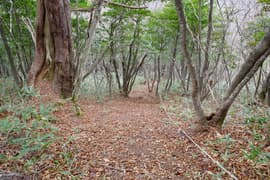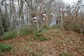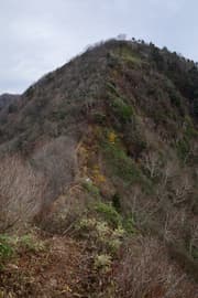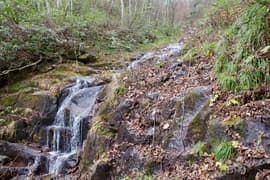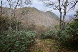 樹林と下生えの笹原に覆われた幅広い尾根を一直線に下る。ところどころにロープが張られた坂があるが、それに頼るほどの急坂ではない。枯れ葉を踏み分けてぐんぐん下り、傾斜が緩むと車を置いた下岳登山口に着く。駐車は1台増えていた。往路の沢と滝、復路の縦走路からの展望と変化に富んで、とても楽しい山行であった。