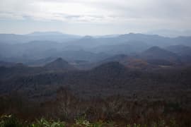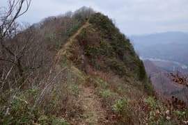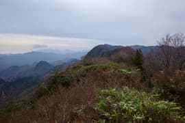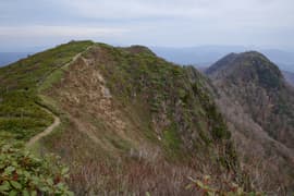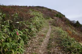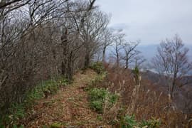 昼食を終えて下山にかかり、お楽しみの縦走路に入る。笹原を綺麗に刈り払った登山道をゆるゆると下って行く。展望も開け、右側の崖下を覗き込んで高度感を楽しんだりする。これは気持ちの良い道だなあ。晴れていればなお良かったが、眺めがあるので大満足だ。