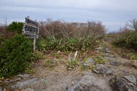 縦走路を進むに連れて、高度も少しずつ下り、樹林や笹の丈が高くなってくる。しかし、眺めはまだまだ開けて楽しめる。小さなアップダウンを繰り返し、最後に短い急坂を登ると下岳の山頂に着く。ここで一休み。狭いピークに露岩が点在し、岩の上に三角点標石が鎮座している。また、「下嶽頂上」の文字が掠れた古い山名標識が風雪に耐えて立っている。振り返ると、七ヶ岳の頂上がもう遥か彼方に小さくなって見える。