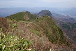 程なく七ヶ岳頂上の西の稜線に登り着く。眼前には南面の展望が開け、昨日登った荒海山も見える。その左奥の高峰群は高原山かな。手前左にあって目を惹く小さな鋭峰は門倉山というらしい。ここから左へ、なだらかな低木帯の稜線をひと登りして、七ヶ岳(一番岳)の山頂に着く。