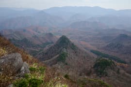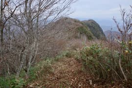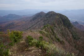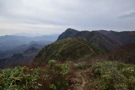縦走路は小さく上下しながら緩く下る。1588m標高点峰の手前に小ギャップがあり、急坂を下ったのち、固定ロープが張られた急坂を登り返す。と言っても、特に危険はない。再び小さな上下のある稜線歩きとなり、1588m標高点の頂上はどこか気付かずに通過。振り返ると既に七ヶ岳(一番岳)の頂上からだいぶ遠ざかっている。縦走路を進むと、下岳が見えてくる。下岳まで、まだまだ縦走が楽しめそうだ。
