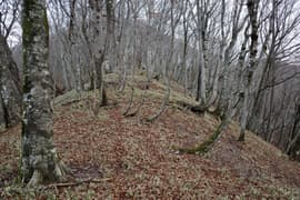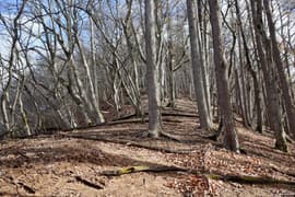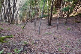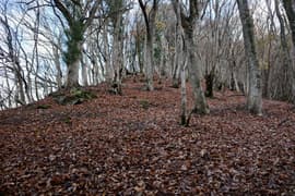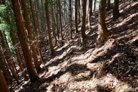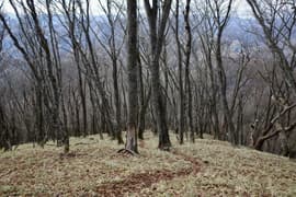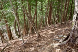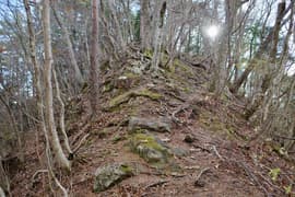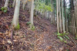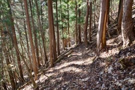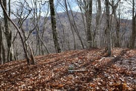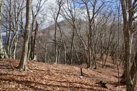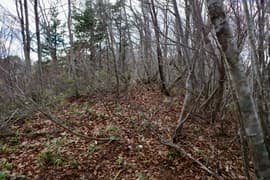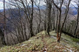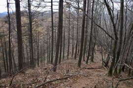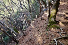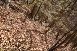 尾根が急峻なため、登山道は右斜面をジグザグに下り始める。道型は細く微かで、落ち葉も厚く積もる。滑落したら止まらないような急斜面なので、一歩一歩慎重に歩く。ここが今日の行程で一番の難所だ。