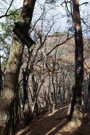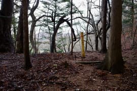 独鈷山登山口の「猫の野仏」まで、R121を歩く。歩き始めてすぐの道端が塩沢山の登山口で、「栃木百名山 塩沢山→」の道標がある。登山道を覗き込むと杉林の中にか細い踏み跡が通じ、なんか、貧相な沢の出合を見たような雰囲気を感じる😅