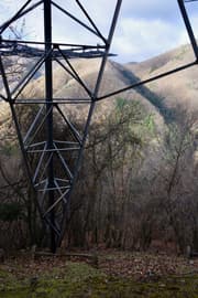 登山道は杉林の急斜面を斜め上に登り、切り返して枝尾根の上に出る。木立を透かして、R121沿いの独鈷沢の集落が見おろせる。送電線巡視路の黄色標柱があり、この道は送電鉄塔に通じているようだ。果たして、冬枯れの林に覆われた急峻な枝尾根を、落ち葉に覆われた微かな踏み跡を辿ってジグザグに登ると、送電鉄塔に登り着く。