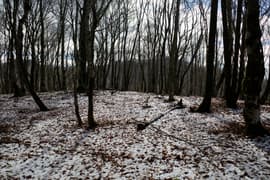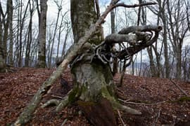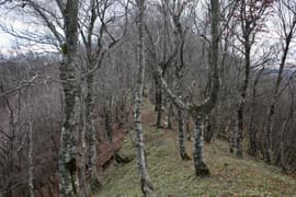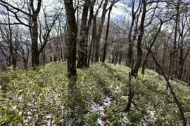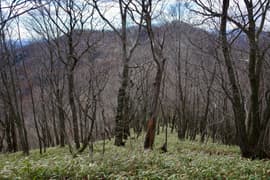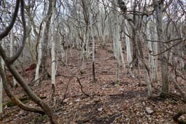 ゆるくて全然疲れない登りが続く。やがて、薄くシャーベット状に積もった雪が断続的に現れる。一応、スパッツを持参しているが、使う程の積雪ではないと判断して、そのまま進む。途中、ブナの幹から別のブナの根が生えたかのような異形のブナを見た。遊星からのブナ星人などと連想。ちょっと不気味。
