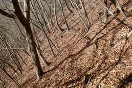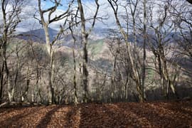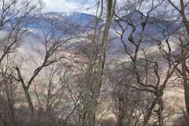 巡視路は送電鉄塔で終点で、この先、道型はないが、藪も皆無。枝尾根を一直線に急登すると、程なく傾斜が緩んで、広くなだらかな尾根の上に出る。すっかり葉を落とした木立の間から日が差して明るい。ゆるゆると尾根を登る。木の間から左手に冠雪した荒海山を望む。2週間前に登った際、頂上では暑い程の陽気だった。季節の急な変化を実感する。