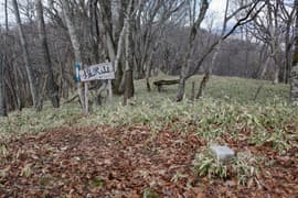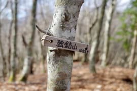 だらだらと登って1023m標高点のなだらかなピークを過ぎ、三角点標石のある独鈷山の頂上に着く。「独鈷山 1023.9」の小さな山名標がある。木立に囲まれ、展望はアテラ沢の谷を隔てて塩沢山辺りの稜線が見える程度。雰囲気は明るいが、静けさに包まれた寂峰だ。