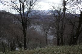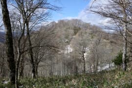 三依山の東のピークが今日の行程の折り返し点で、ここから塩沢山へは南西に向かうが、反対側の稜線から高原山の展望が得られそうなので、ちょっと寄り道。スケールを小さくした八ヶ岳という感じで、前黒山、明神岳、釈迦ヶ岳、鶏頂山などの峰が連立して眺められる。スキー場(ハンターマウンテン塩原)はまだ雪が少なく、オープンは先のようだ。