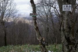 やがて低い笹原となり、その中の微かな踏み跡を辿る。尾根幅が狭まり、傾斜も少し増す。笹に積もった雪でトレックパンツの裾が濡れて、靴の中もじんわり冷たい。やっぱり、スパッツを着けた方が良いかなあ、と迷っているうちに三依山の頂上に到着する。
