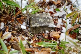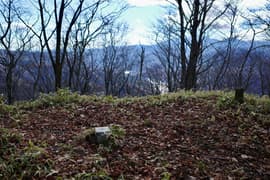頂上には栃木の山紀行さんや山部さん他、3つの山名標がある。木立に囲まれて展望はないが、切れ間から白くなった七ヶ岳を遠望する。三角点標石もあるはずだが見当たらないな。ちょっと探して、笹の間に半ば埋もれていたのを見出す。笹の上に雪が積もって腰を下ろせる場所がないし、北風が吹き抜けて寒々しいので、ゆっくり休憩できない。もう少し先に進んだところで昼食にしよう。