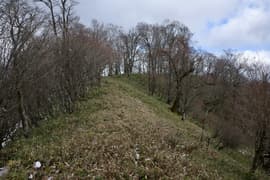 塩沢山に向かって南西へ稜線を辿る。こちらも樹林は冬枯れだが、下生えが笹原の黄緑に覆われ、段々晴れて日が差してきたこともあり、雰囲気がぐっと明るく感じる。右手には三依山の円い頂が青空を背景に眺められる。天気は晴れに向かっているようだ。