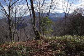 この先は笹が下生えの小さなアップダウンが塩沢山まで続く。途中、低木帯の小枝がちょっと被さる区間があるが、藪とまではいかない。笹の間に踏み跡が続くが、これはけもの道だろうな。マーキングの類は少ない。左には大塩沢の意外と深い谷を隔てて、日光・那須塩原市境稜線が横たわり、その向こうになだらかな山裾を広げた高原山が見える。