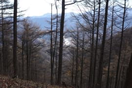 まず、頂上から西尾根を下る。笹原に明瞭な道型が通じ、快適に高度を落とす。カラマツ林に入り、ところどころで五十里湖を眺める。ちょっと登り返し、平坦なピークで左(南)の尾根に向きを変える。ここからの下りが結構、急である。