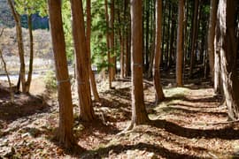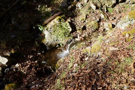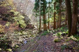 この先の尾根の下りも急だが、左の斜面をジグザグに下る道もあるし、尾根通しに下ることも可能。やがて「一服ウチワ」の標識があり、ここで尾根から右に外れて、水のない急峻な谷間をジグザグに下る。落ち葉に隠れて転石が多いので、石車に乗らないように注意。谷間を下り切って、小さな沢を渡る。