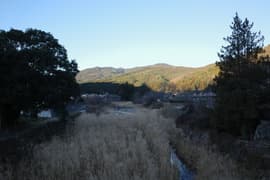 今日の天気は予報通り快晴。風はなく、放射冷却が効いて冷え込みが厳しい。ULDジャケットを着込んで出発する。上半身はこれで暖かいが、下半身が寒い。そろそろ、トレッキングパンツの下にもインナーを着た方が良い季節かも。宿(しゅく)交差点で左折し、都幾川を渡る。橋上から上流に眺められるゆったりとした山は堂平山のようだ。その左には剣ヶ峰の小さな鋭峰も見える。