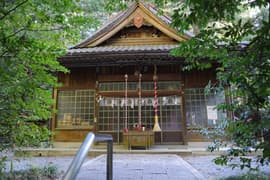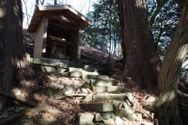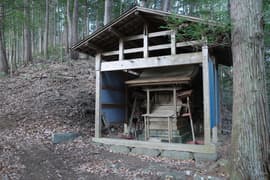 橋を渡った先で右折し、少し進んだところで左折。畑地の間の車道に入る。ここまで、道標の類はなし。緩い坂道を登って、すぐに尾根上に着く。水道施設のフェンスの角を曲がり、尾根を絡んで登る山道に入る。道型は明瞭で、良く踏まれている。ひと登りすると覆屋の下に社殿を納めた神社が現れる。「奉納八幡神社童輿御祭禮」と記された木札があり、八幡神社と言うらしい。社殿の左脇に子供御輿もある。坂道を登って身体が暖まって来たので、上着を脱いで衣類を調節する。