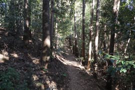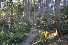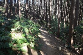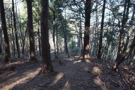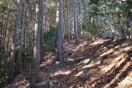 八幡神社からさらに尾根上を進み、左斜面をトラバースする道に入る。杉植林に覆われて展望はないが、朝日が横から林間に差し込み、下生えの常緑樹やシダを照らし出して、雰囲気は明るい。
